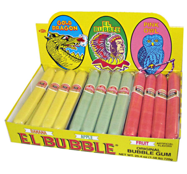 El Bubble Original Bubble Gum Cigars come in three exciting flavors: Gold Dragon Banana, El Bubble Apple, and Pink Owl Fruit. Each flavor is fruity, sweet, and refreshing