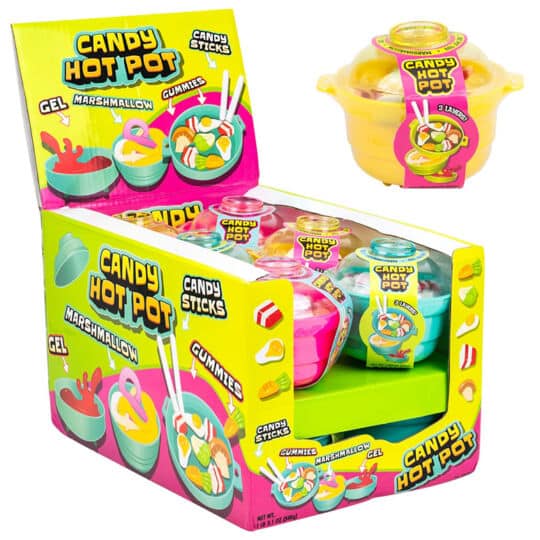 Candy Hot Pot 1.58 ounces is a multi-tiered plastic pot containing ingredients for a candy Chinese fondue, marshmallow noodles, dextrose chopsticks, liquid candy sauce and gummy candy condiments.