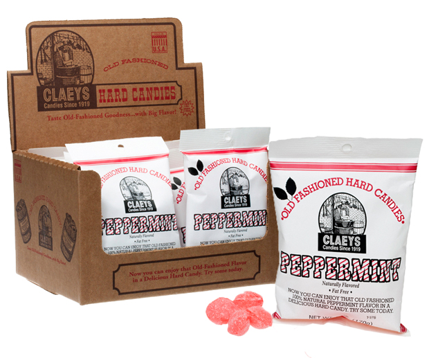 Since 1919 Claeys Candy has been making these hard candies in South Bend, IN. Now you can enjoy these timeless Peppermint drops in peg bags.