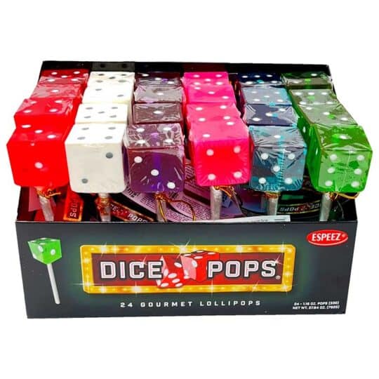 Dice Pops Cube Lollipops are a great addition to make an ultimate candy collection. Each lollipop is individually wrapped and comes in an attractive counter display. Delicious flavors include White-Tutti Frutti, Red-Strawberry, Blue-Blue Raspberry, Pink-Bubble Gum, Green-Green Apple, & Purple-Grape.