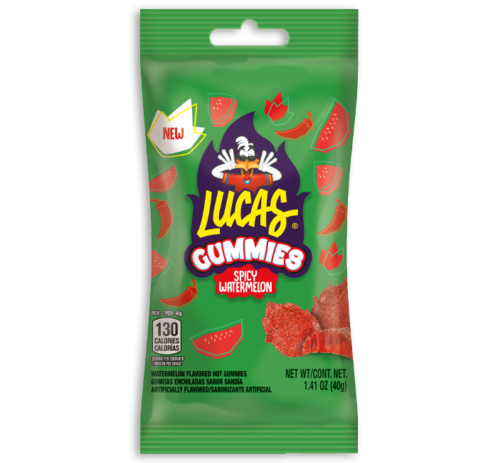 Lucas spicy watermelon flavored gummies are flame shaped gummies that are hot and spicy and smothered in chili. Peg bags in display.