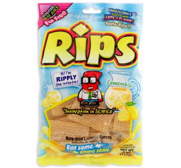 With intense fruit juice flavor and a fat free candy; these Rips Bitess in Lemonade flavor licorice pieces are a fun way to eat your candy. Eat some, share some, either way, they are tasty bites in a peg bag.