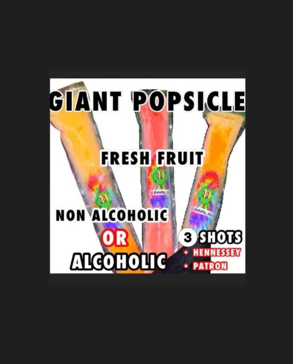 Giant popsicle made with fresh fruit and 3 shots of Hennessey and Patron