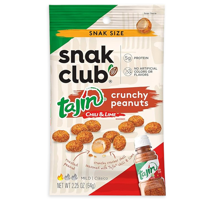 Snak Clubs Tajin Crunch Panuts are perfection with crunchy spicy peanuts that are perfectly toasted with just the right touch of Tajin seasoning, a mixture of chili peppers and sea salt, and lime. Mild in heat but bold in flavor. In a peg bag.