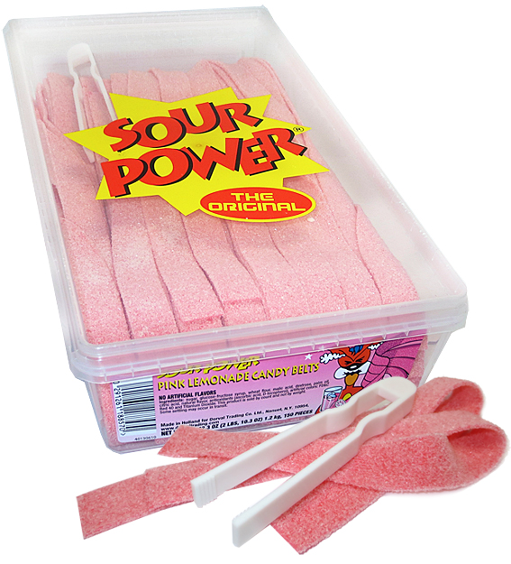 The original Sour Power Candy belts in 150 count tubs in pink lemonade flavor.