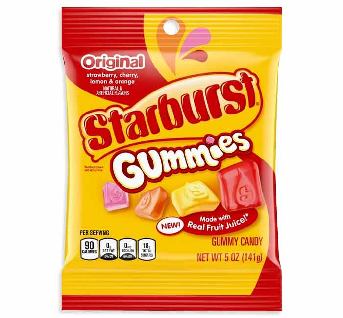 The same yummy flavors as Original Starburst, but in a tasty gummy made with real fruit juice! Flavors include lemon, cherry, strawberry, and orange. In a peg bag.