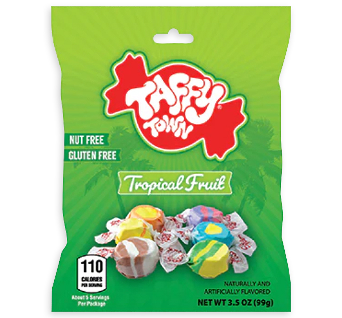 Taffy Towns Tropical Peg Bag delivers a sweet island escape with chewy, flavorful taffy in Banana, Coconut, Mango, Passion Fruit, Pineapple, and Tropical Punch. Each bite is soft, fruity, and refreshing—bringing the taste of the tropics wherever you go.