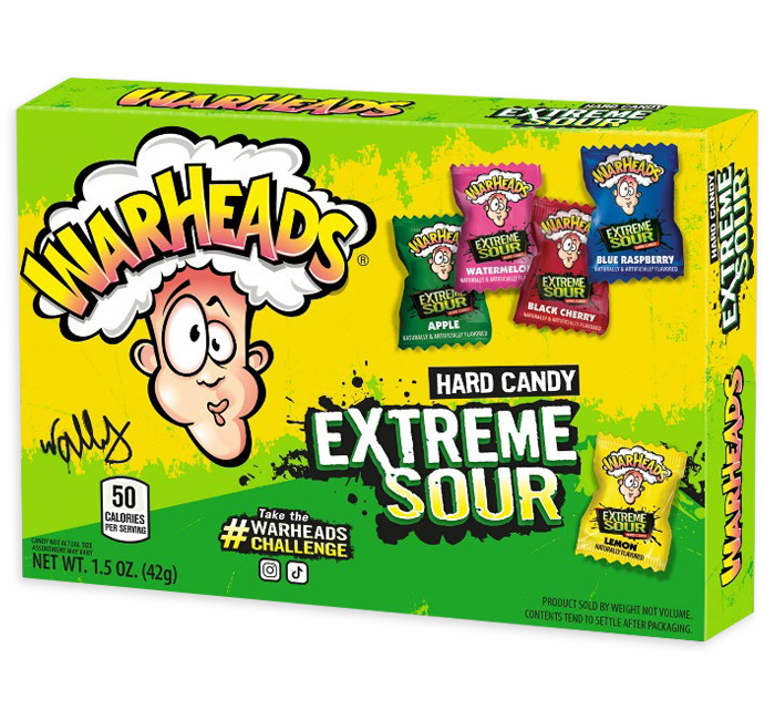 Since 1985 Warheads have set the standard for sour candy. Today its still the candy of choice for the super sour seekers. Now enjoy these extreme sour hard candies in a handy theater box. Individually wrapped flavors of blue raspberry, watermelon, lemon, black cherry, and apple in each box.